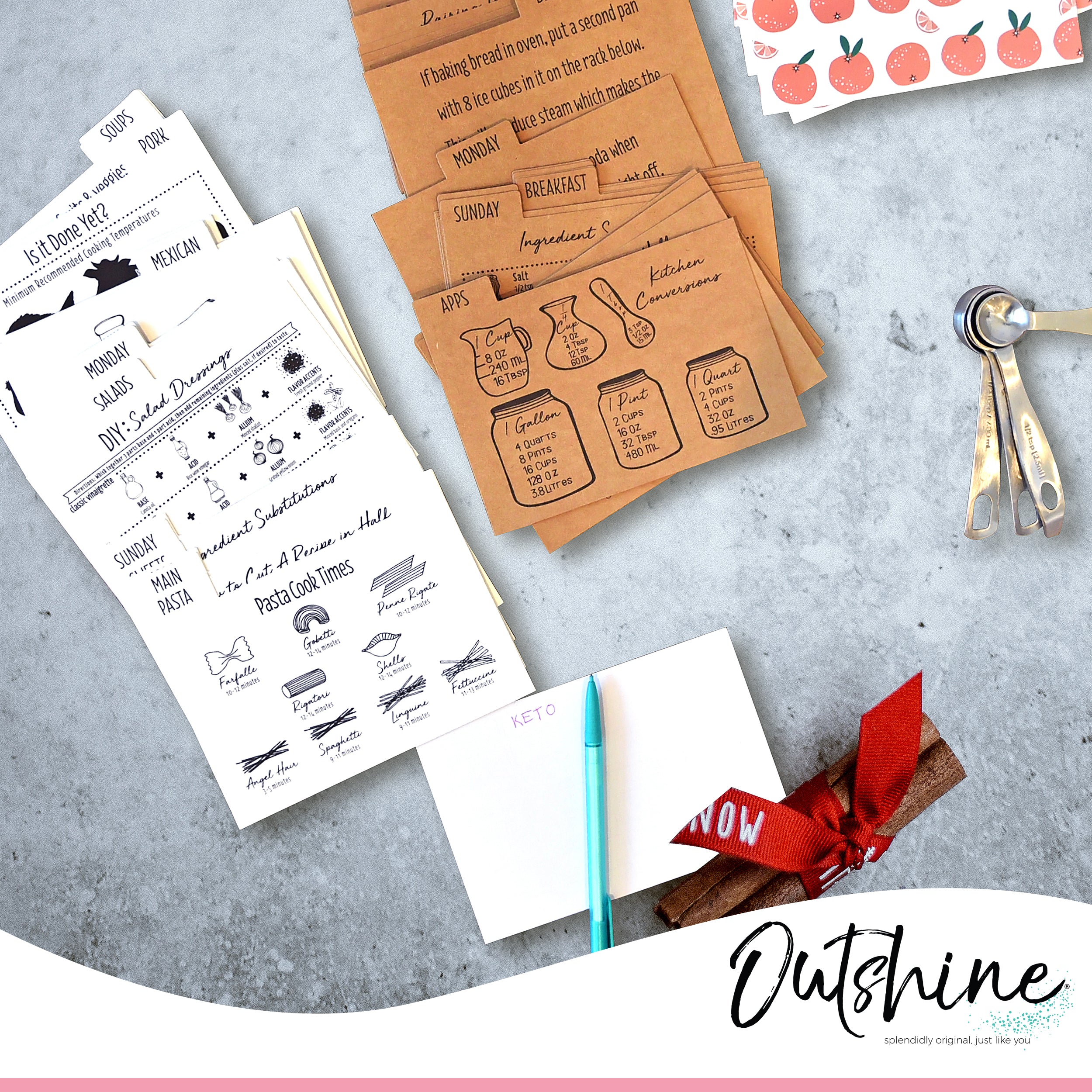 MAKE WHIPPING UP YOUR FAVORITE MEALS MUCH EASIER Get Organized Outshine index card dividers help you locate the recipe you’re looking for in a jiffy! Whether it’s an appetizer or beverage, dessert or salad, chicken or pasta dish, our set makes identifying it a breeze with a total of 24 (4” x 6”) tabbed dividers. Have unique recipes you’d like to organize? Just use one of the 28 adhesive labels that come included to personalize your dividers. Tips You’ll Love This is more than just a recipe box divider set; it’s an opportunity to brush up on your cooking skills and take your entertaining game to the next level. We’ve accentuated the dividers with beautifully printed kitchen tips and cooking hacks you’ll love to reference. Do you know how many ounces are in a pint? How much longer you should cook Farfalle compared to spaghetti? What temperature does pork need to hit before it’s ready? Get your set and learn the answers to all these and so much more.